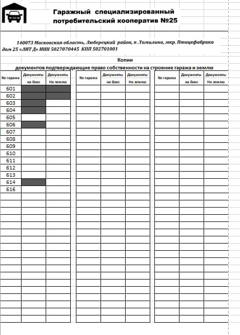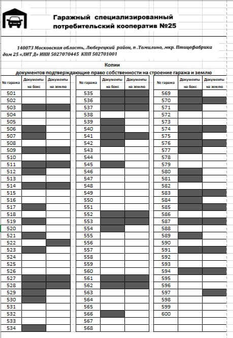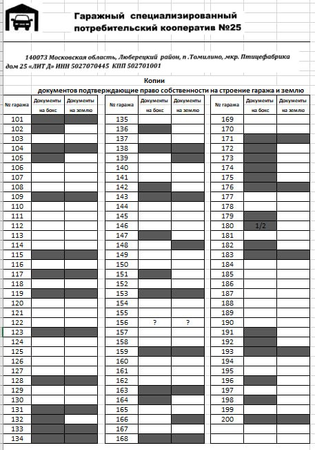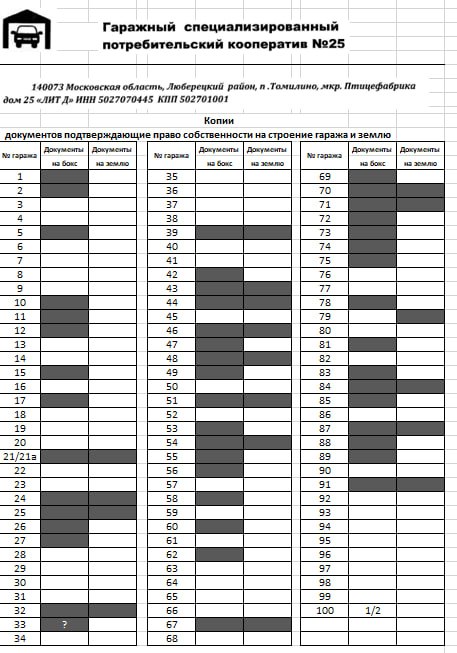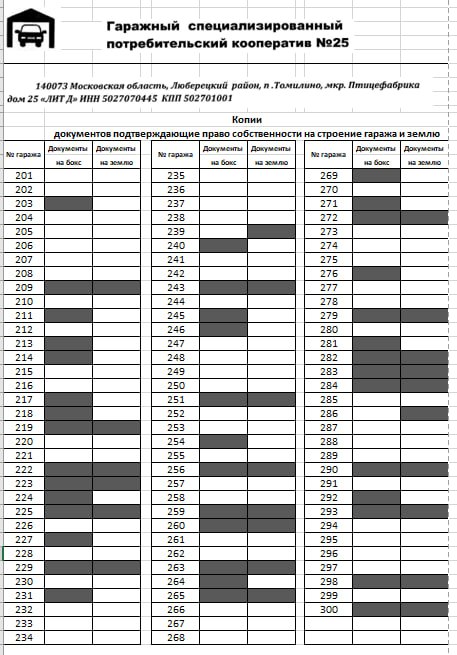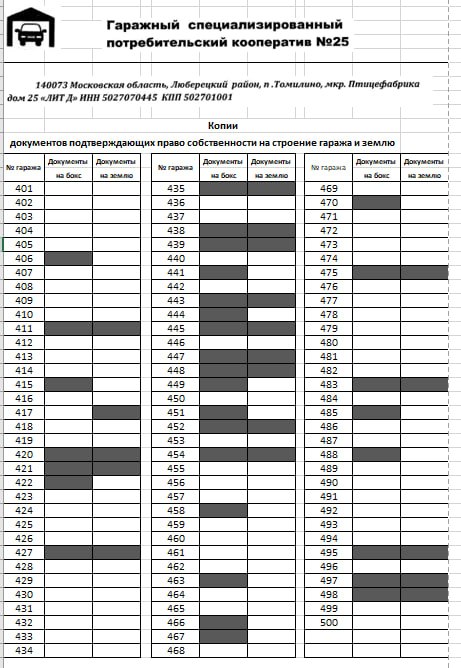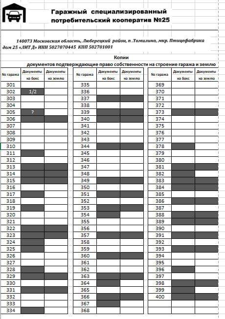 Уважаемые члены ГСПК-25. Необходимо подтвердить право собственности на гараж и землю, предоставив копии документов в правление. Отмеченные в таблицах гаражи — необходимо предоставить документы. В первую очередь это касается новых собственников. Подробную информацию можно получить в часы приема в правлении.